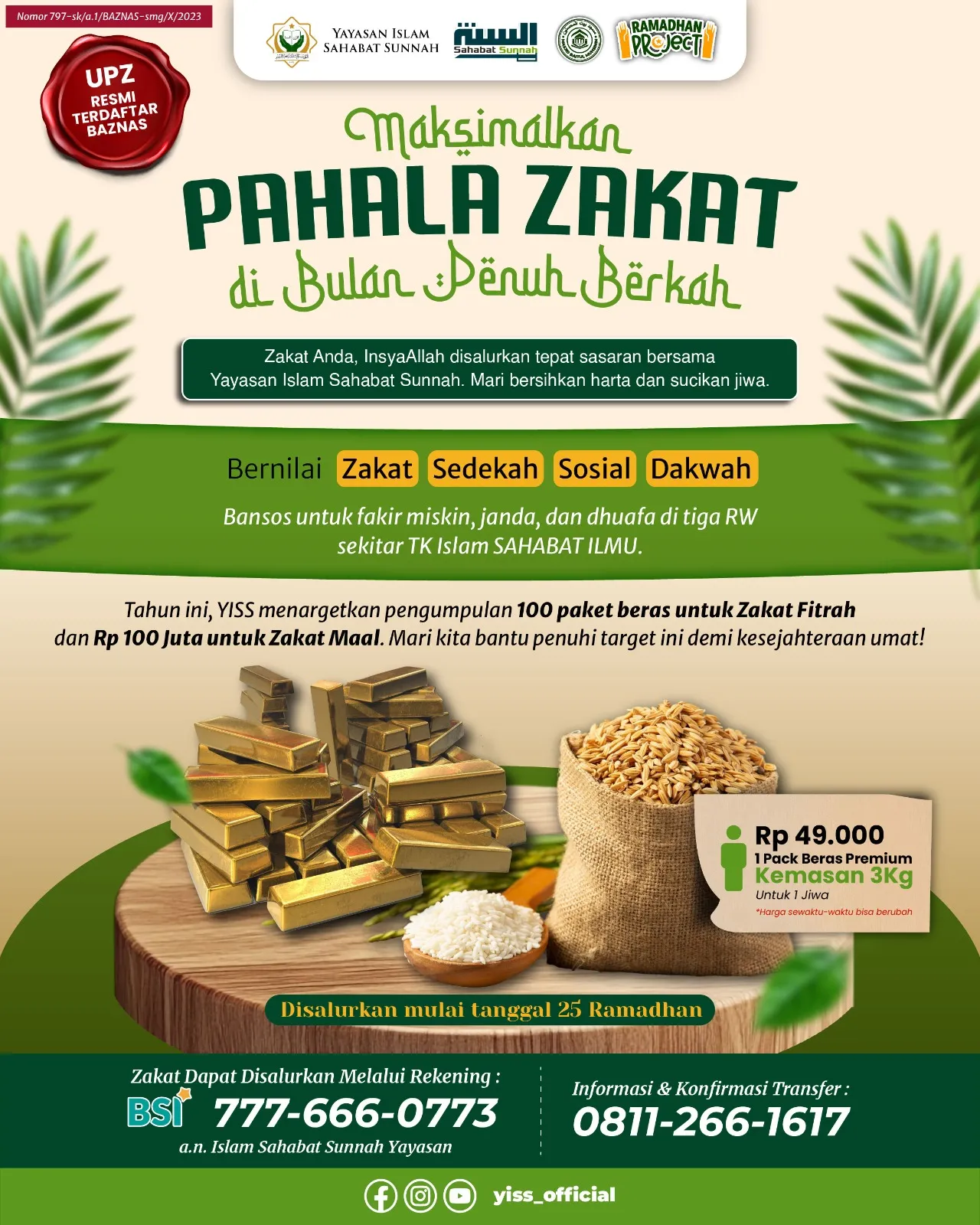 🎯 Tahun ini, YISS menargetkan pengumpulan 100 paket beras untuk Zakat Fitrah dan Rp 100 Juta untuk Zakat Maal. Mari kita bantu penuhi target ini demi kesejahteraan umat!